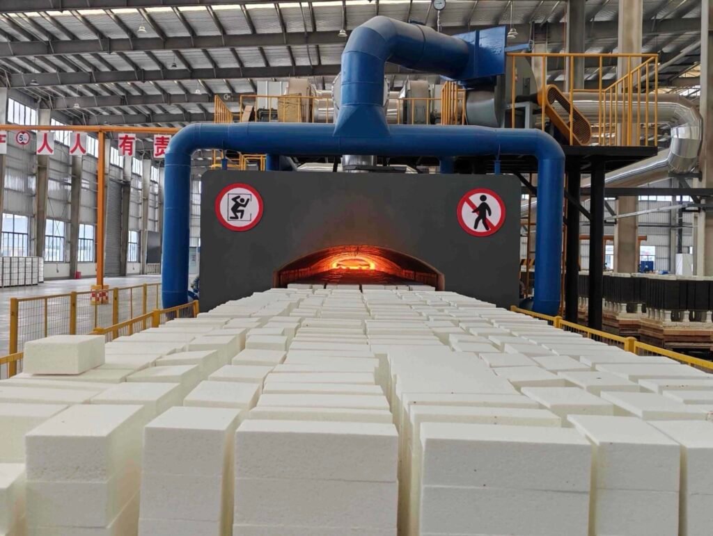What you see: A traditional brick kiln with rows of clay bricks entering a firing chamber heated to over 1000°C.