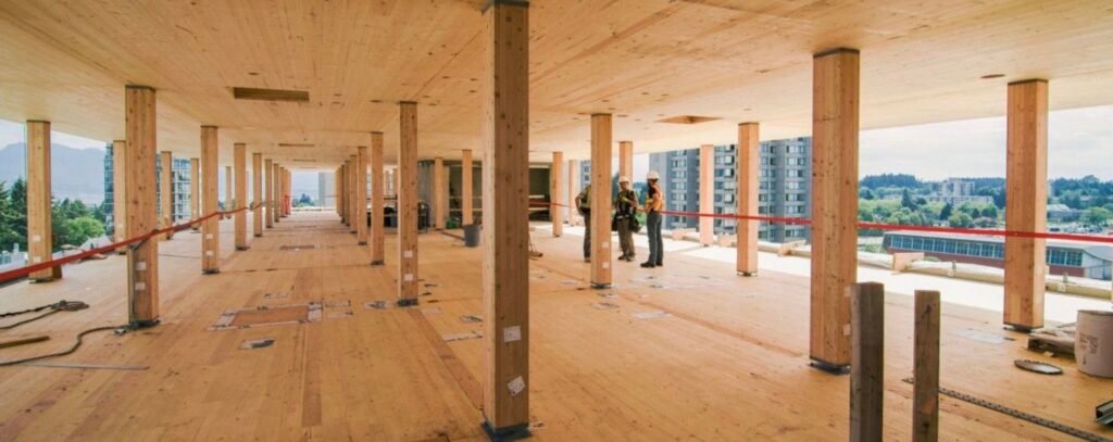 What you see: A mass timber superstructure showing CLT floor panels and glulam beams being installed.